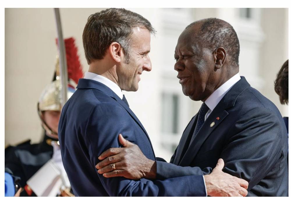 Emmanuel Macron salue le président de la Côte d’Ivoire, Alassane Ouattara, à son arrivée pour assister au Sommet de la Francophonie au château de Villers-Cotterets, le 4 octobre 2024.