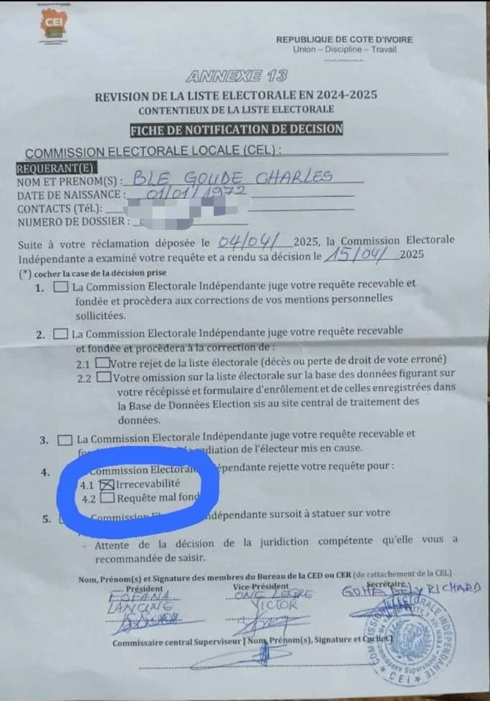 La Commission électorale indépendante (CEI) a déclaré irrecevable la requête de Charles Blé Goudé dans le cadre du contentieux sur la liste électorale. Cette décision a été signifiée au concerné à travers une fiche de notification datée du 17 avril 2025 et signée de plusieurs responsables de l’institution électorale. Le président du Congrès panafricain pour la justice et l’égalité des peuples (COJEP) avait déposé un recours le 4 avril dernier auprès de la CEI afin d’obtenir sa réintégration sur la liste électorale.