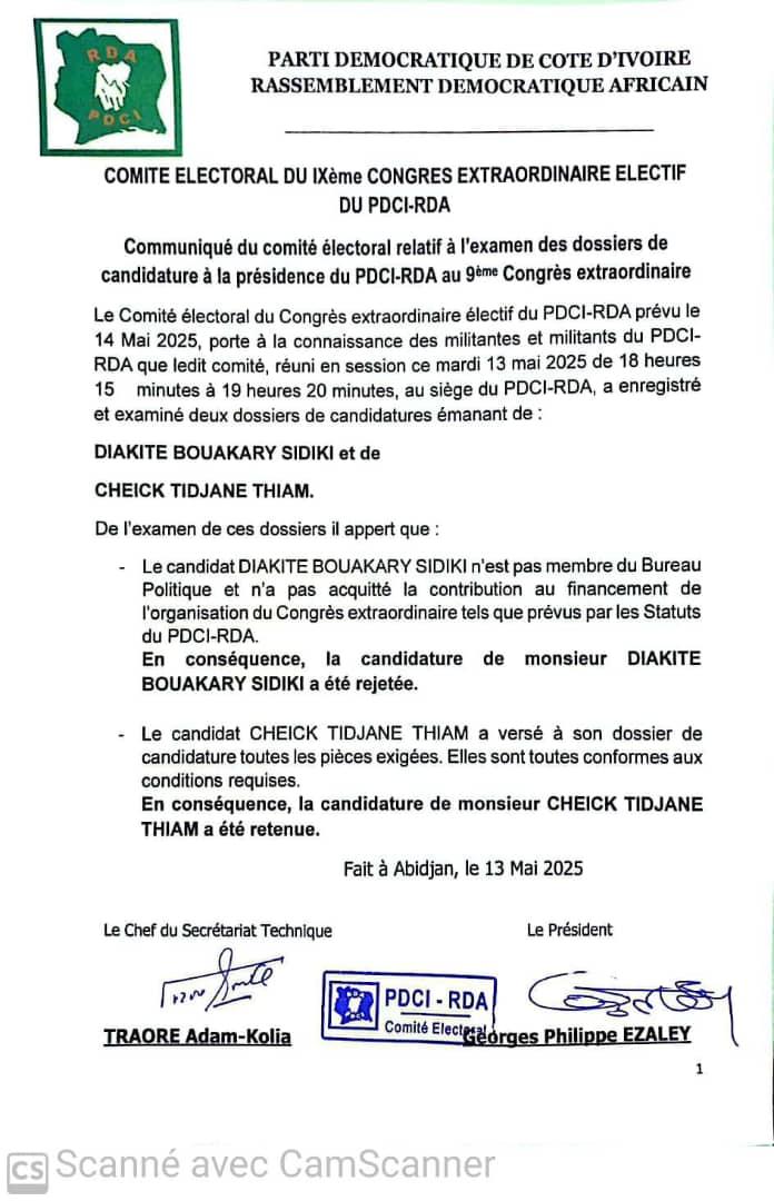 Réuni ce mardi 13 mai 2025 en fin d'après-midi, le comité électoral du 9ème congrès extraordinaire du pdci-rda prévu le 14 mai 2025, a validé la candidature de Cheick Tidjane Thiam au poste de président du parti.