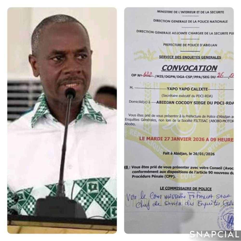 Le Secrétaire exécutif en chef du Pdci-rda, Calice Yapo Yapo, est convoqué à la préfecture de police d'Abidjan située sur la route d'Abobo, le mardi 27 janvier 2027 à 9h. La convocation adressée à cet effet et reprise par les médias mentionne que le numéro 2 du plus vieux parti politique ivoirien doit se présenter au service des enquêtes générales dirigé par le commissaire Fofana Sada. L'ancien ministre du commerce sous la présidence d'Henri konan Bédié est prié de se faire accompagner par son avocat. Les motifs de la convocation ne sont pas mentionnés.