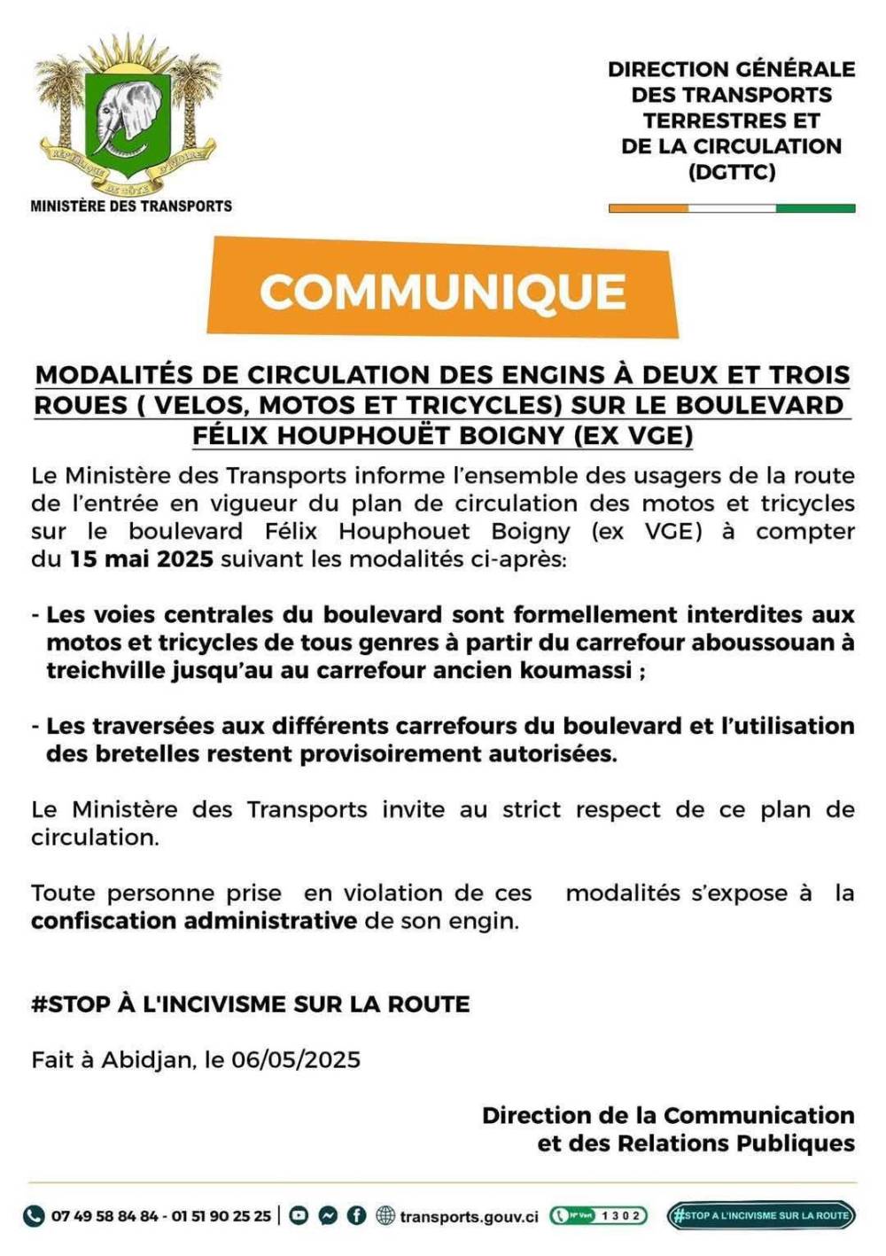Dans un communiqué publié ce mardi 6 mai 2025, le ministère des transports informe les usagers de la route que les motos et les tricycles sont interdits de circulation sur le boulevard Félix Houphouët-Boigny (ex VGE) à compter du 15 mai 2025.