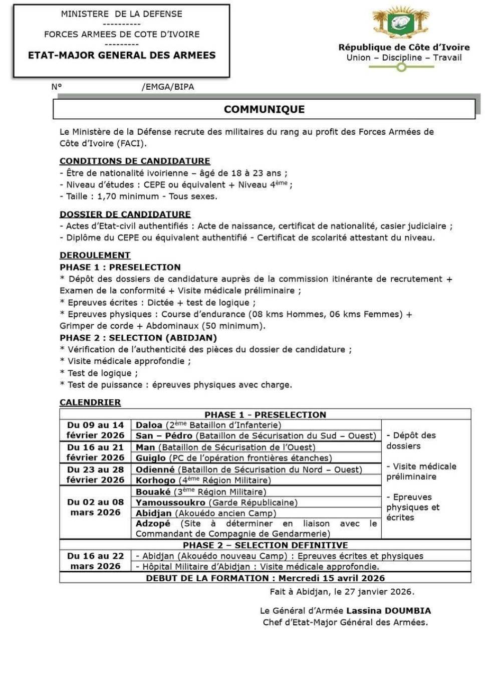 Le ministère de la Défense a lancé une opération de recrutement de militaires du rang au profit des Forces armées de Côte d’Ivoire (FACI). La campagne es...